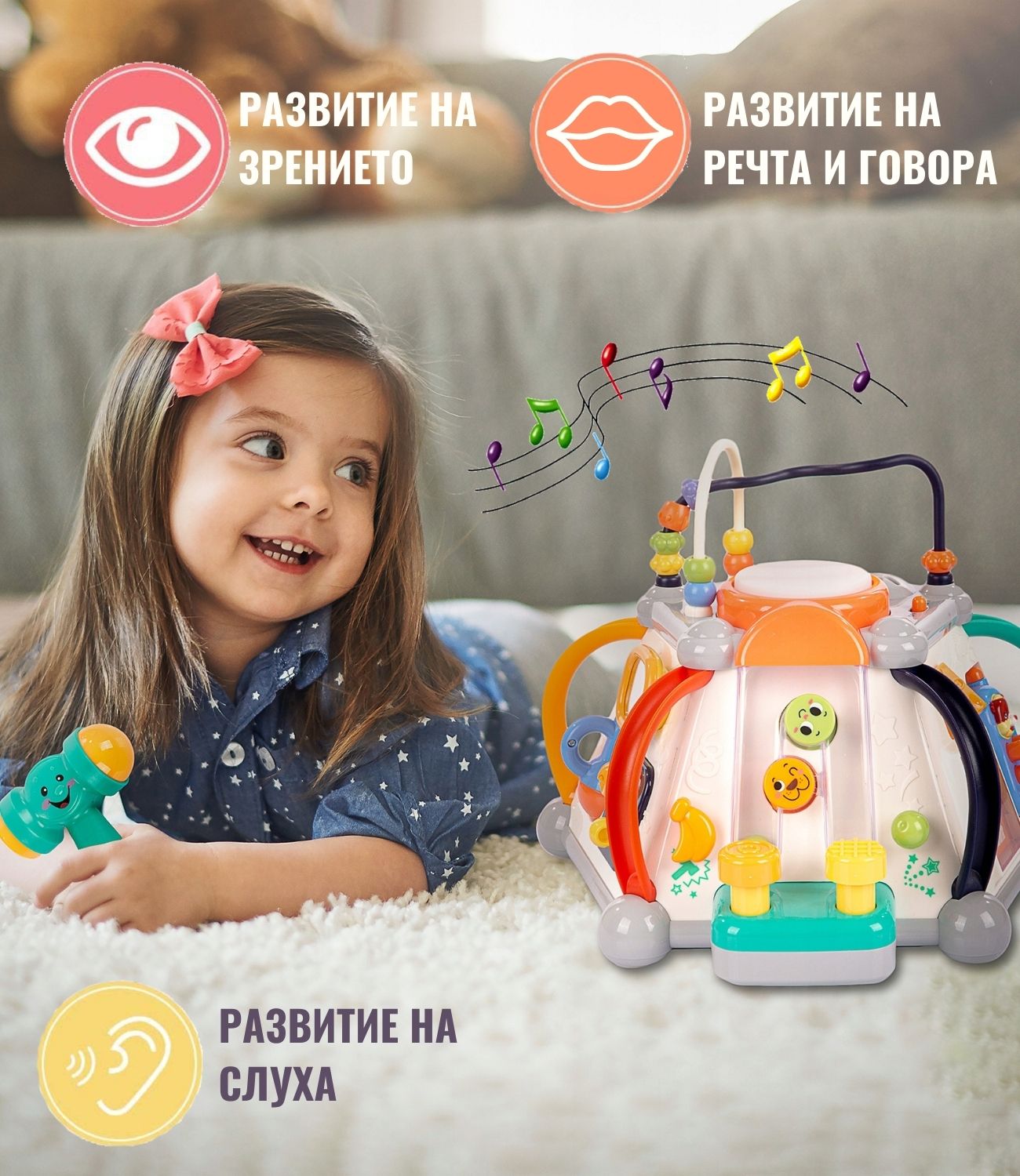 ❤ НАСЪРЧАВАНЕ НА ЛОГИЧЕСКОТО МИСЛЕНЕ: Някой неща не стават просто така. Това вече твоето мъниче го знае. То знае, че ако натисне копчето - музиката започва да свири. Ако завърти звездичката - ще пусне и покаже на мама любимата мелодика. Ако удари с чукчето по барабана - той ще светне. И още, и още логически свързани дейности, които го провокират в мисленето и насърчават в действието.