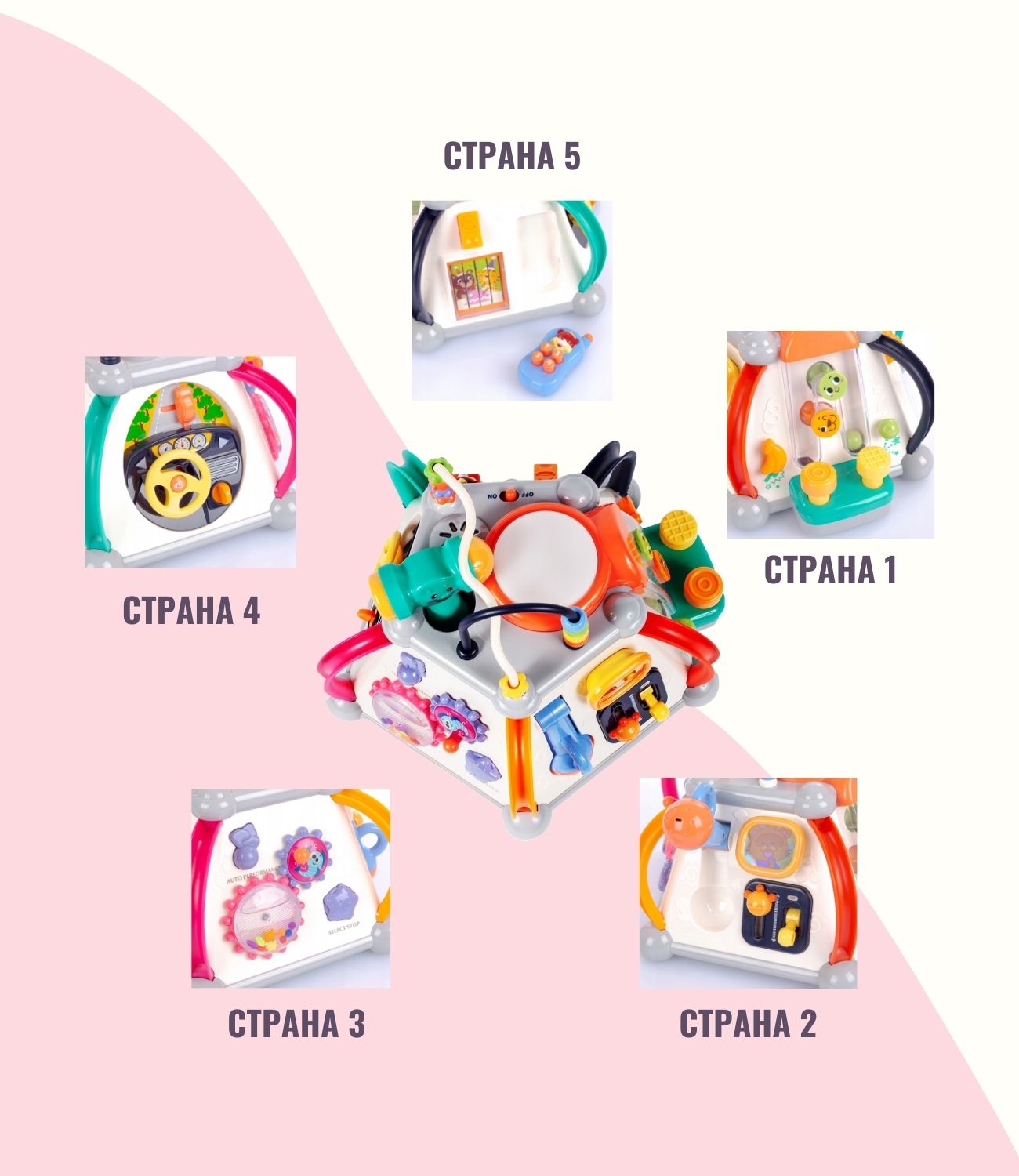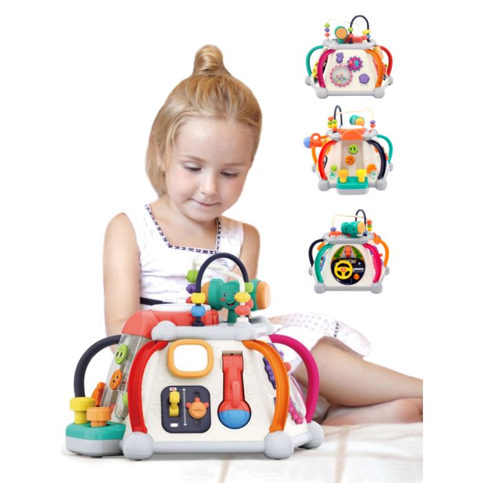 ✔️ Занимателни функции 15 - в - 1: светещ барабан, микрофон, телефон, музикална нота, различни видове копчета и бутони, въртящ се ключ, клаксон, шофьорско кормило, писти с топчета за прокарване, чукче, зъбчати колела, огледалце, копче - звездичка, звънец и т.н.