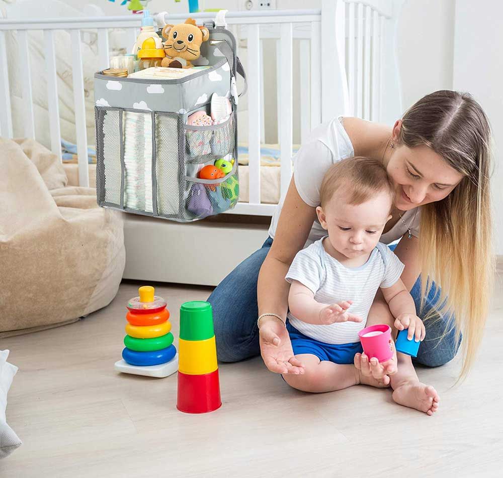 ✔️ Закачане на различни удобни места, за да може всичко необходимо за бебето да бъде под ръка. Подходящ е за закрепване към всякакъв вид легло, маса за повиване, стена, закачалка, дори и на удобно място в автомобила.