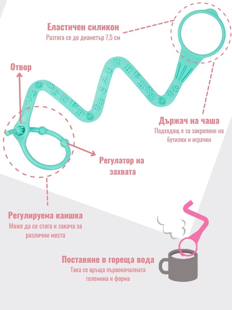 Сигурно ти е дошло до гуша, от онази забавна за твоето бебче игра, в която постоянно изхвърля шишето си или играчката на пода, от количката, когато сте навън или изтърва в колата и всичко попада под предната седалка? И колкото за теб да е напрежение, че отново всичко трябва да се мие и дезинфекцира, мъника те гледа с дяволити очички и страшно много се забавлява. Сигурна съм, че ти се е случвало дори неволно по време на разходка или в някой голям магазин, да не разбереш кога е изпаднала водичката на детето и отново трябва да купуваш ново шише. Знам, защото и на мен ми се е случвало и знам, че наистина е много досадно и неприятно. Но, аз намерих решение и то доста практично. Силиконови държачи, подходящи за чаша, шише с вода, мляко. Става за връзване и закачване на играчки, гризалки и други предмети, които са важни за теб и бебето, и искаш да предпазиш от изгубване. Просто закачаш на дръжката на количката, за някой колан, за столчето в колата или на друго лесно място за закачане, за да са достъпни по всяко време и наблизо. Хубавото е, че пасват почти на всяко шише, заради еластичния силикон. Другия край на държаща е с опашка за закопчаване с три точки, което позволява регулиране на ширината и прикрепването му към различни места. Лесно и надеждно.