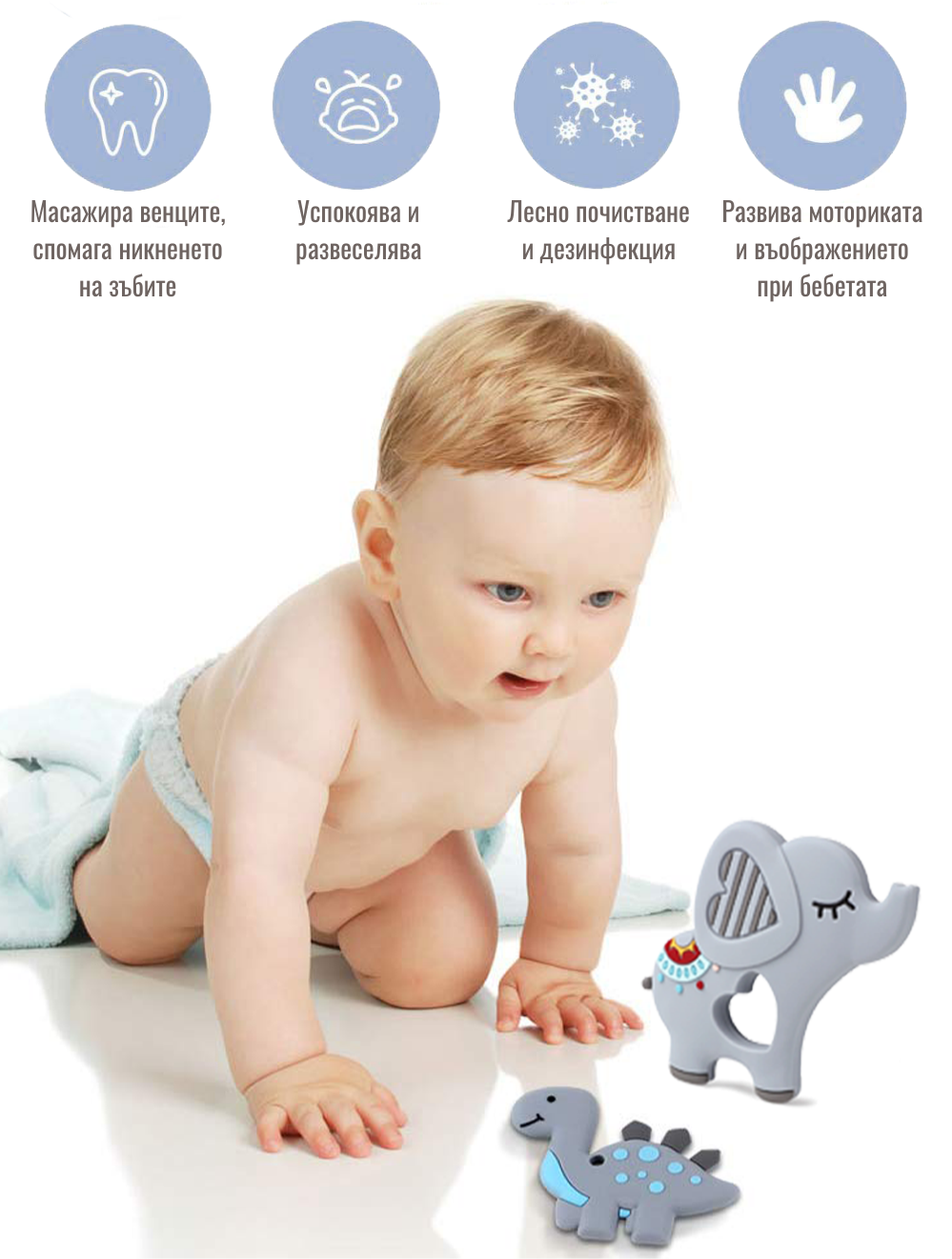 ОБЛЕКЧИ ТРУДНИЯ ПЕРИОД НА НИКНЕНЕ НА ЗЪБКИТЕ ПРИ БЕБЕТО СЪС ЗАБАВНО СИЛИКОНОВО ЖИВОТИНЧЕ, ЛЮБИМ ПРИЯТЕЛ ЗА ГРИЗАНЕ И ИГРА.