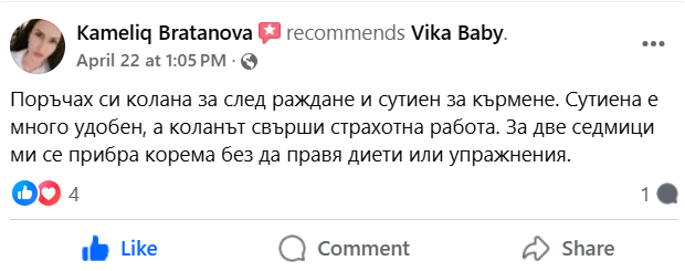 Искаш ли да се чувстваш по-стабилна и уверена в тялото си след раждането? Да имаш усещане за подкрепа и комфорт в коремната област, докато се грижиш за бебето? Знам как е да се чувстваш изтощена от постоянните грижи, недоспиването и новия ритъм на деня. Да имаш желание да тренираш, но да нямаш никакво време и енергия за това. Знам, защото и аз бях така. Времето си минаваше, а нищо не се променяше. Постоянно се питах: “Толкова ли е важно това, след като съм дала живот на това малко и сладко същество? Все пак съм го носила в утробата си 9 месеца и с големи усилия е излязло на бял свят”. Истината е, че възстановяването изисква време и грижа — и това е напълно нормално. По препоръка на моя позната си взех стягащия колан, който се оказа най-полезната за мен покупка след раждането на бебка. С лек хранителен режим, малко повече вода и редовно използване на колана, успях да постигна перфектните резултати, от които съм супер доволна.